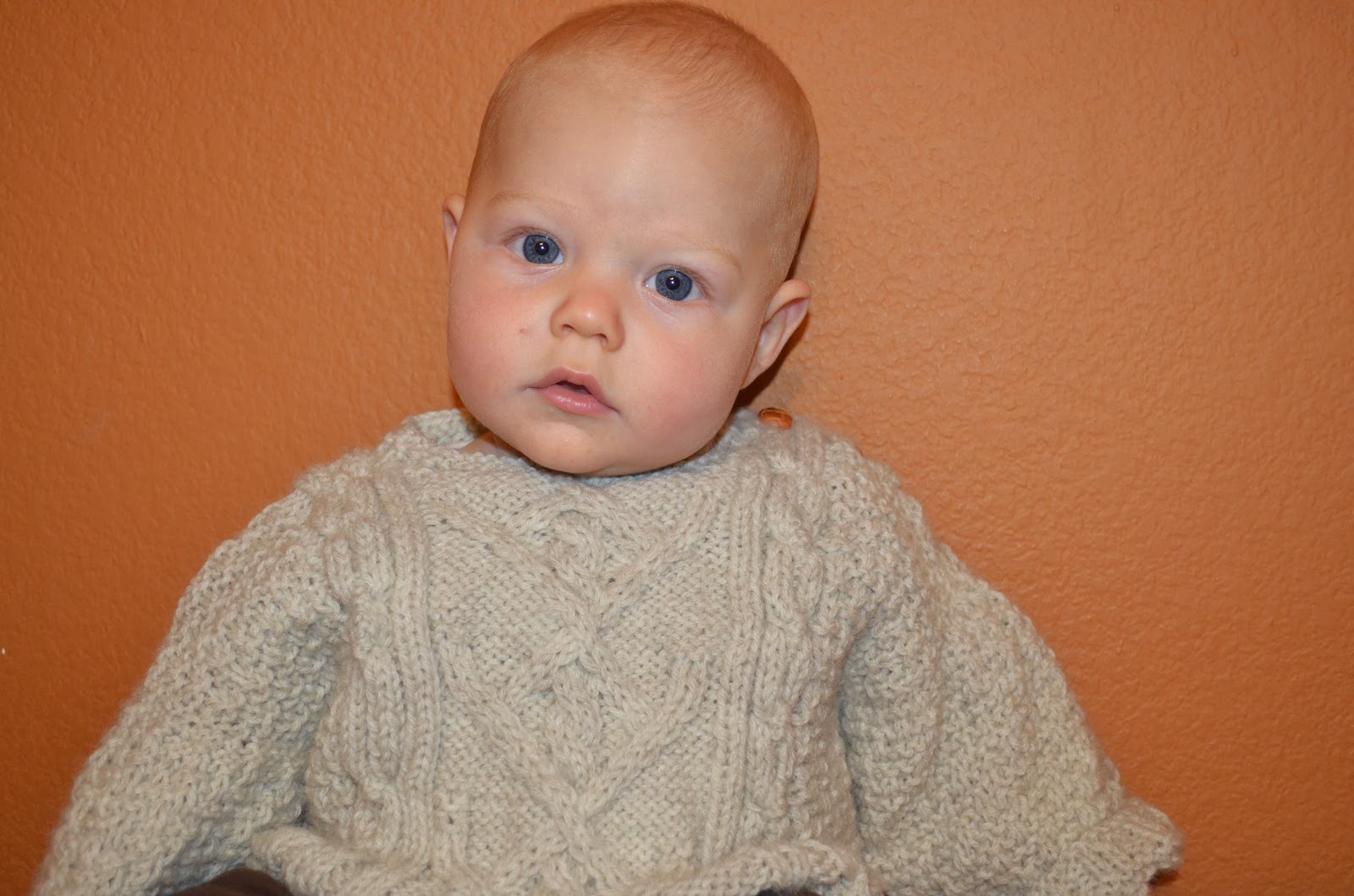 Also, remember that sweater I made for Klein baby #1, yeah the baby that I KNEW was going to be a boy? I finally got to use it (the sweater, not the baby). Looking at Wesley in it, I feel like he should be just getting off a Nordic fishing trip.... the sweater, the pale skin the stunning indigo blue eyes. Any way, fun to finally see the sweater on a baby instead of hanging in the closet.